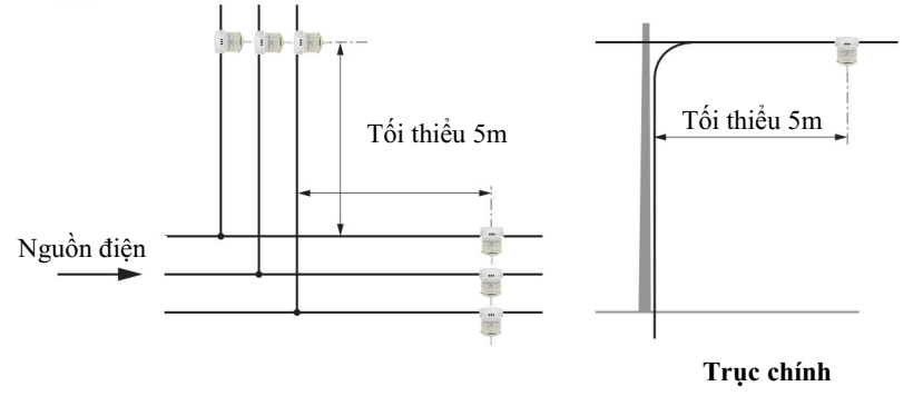 Khi lắp đặt các thiết bị chỉ thị sự cố cần đảm bảo các khoảng cách như hình vẽ dưới đây: