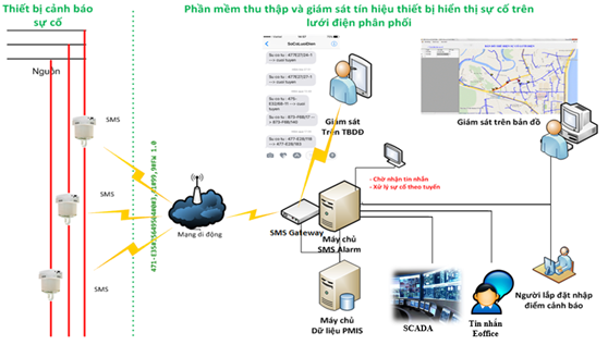 Khi có sự cố, thiết bị SRFI gửi tin nhắn SMS về SMS Gateway (modem GSM) kết nối với máy chủ qua cổng Serial port. Phần mềm trên Server sẽ đọc nội dung tin nhắn, sau đó phân tích nội dung theo cú pháp và xác định vị trí (theo mã trạm), khu vực bị sự cố. Sau khi phân tích xong, hệ thống sẽ gửi tin nhắn SMS tới số điện thoại của các đối tượng quản lý vận hành liên quan để thông báo sự cố. Đồng thời, hệ thống sẽ gửi một gói tin thông báo cho tất cả các máy trạm có kết nối với máy chủ để thông báo vị trí và tình trạng sự cố. Phần mềm trên Client sẽ phân tích và hiển thị thông tin cảnh báo bằng bản đồ số trên màn hình máy tính.